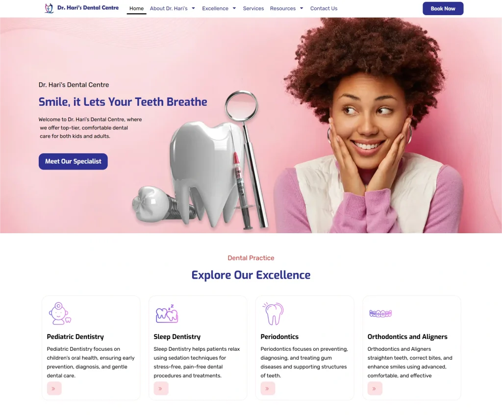 Dr. Haris Dental Centre in Chennai is a premier destination for quality dental care, offering specialized services in braces, smile design, pediatric dentistry, implants, and cosmetic procedures. The goal was to transform the clinic’s online presence into a top-ranking resource for patients searching for reliable, expert-driven dental solutions in Chennai.